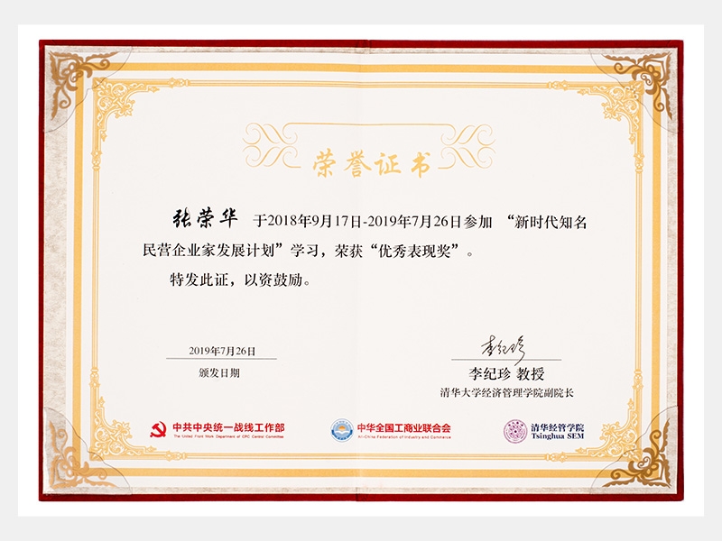 “新时代知名民营企业家发展计划”学习中,荣获“优秀表现奖”