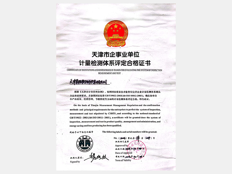 天津市企事业单位计量检测体系评定合格证书
