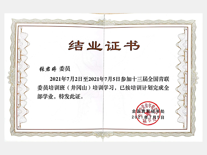 2021年7月2日至2021年7月5日参加十三届全国青联委员培训班(井冈山)培训学习(结业证书)