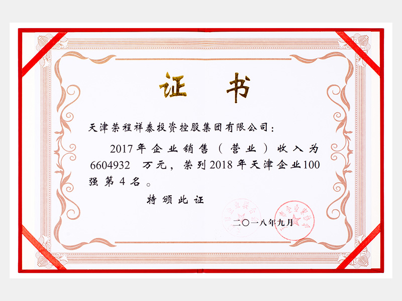 祥泰荣列2018年天津企业100强第4名