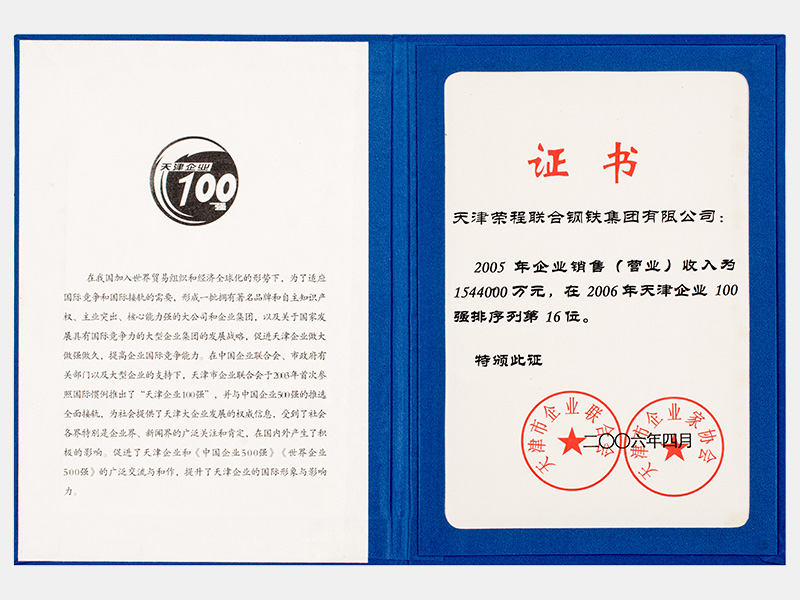 2005年企业销售(营业)收入为1544000万元,在2006年天津企业100强排序列第16位