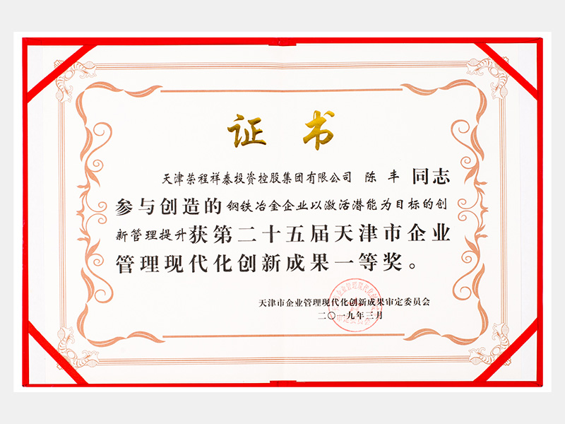 陈丰同志参与创造的钢铁冶金企业以激活潜能为目标的创新管理提升获第二十五届天津市企业管理现代化创新成果一等奖。
